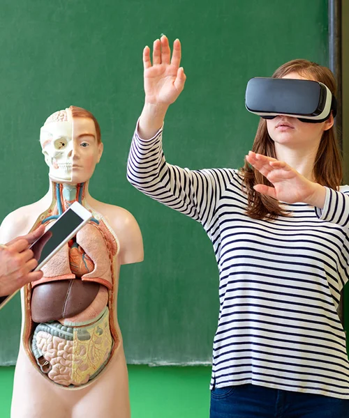 Augmented Reality (AR) and Virtual Reality (VR) can be used to look closely at intricate systems taught in school. For instance, med students use an AR app to interact with more than 17,000 body structures in 3D graphics. This allows students to better understand body anatomy by interacting with the different body structures and learning the functions of every muscle.